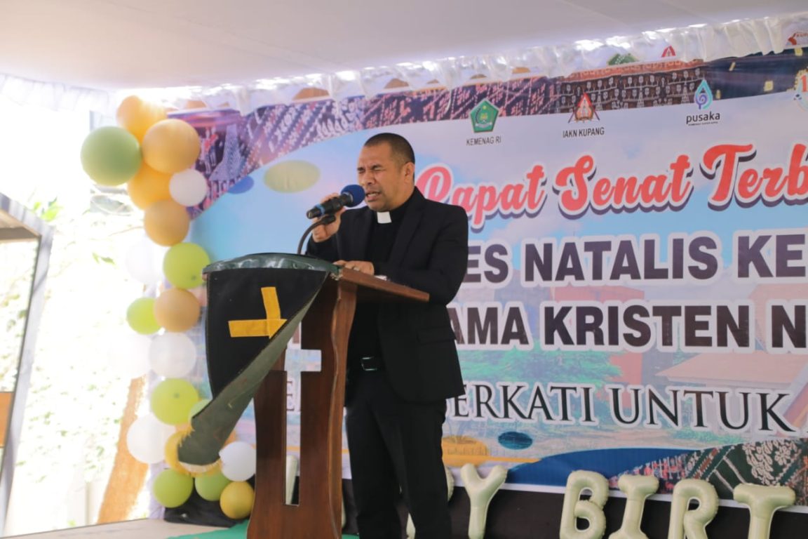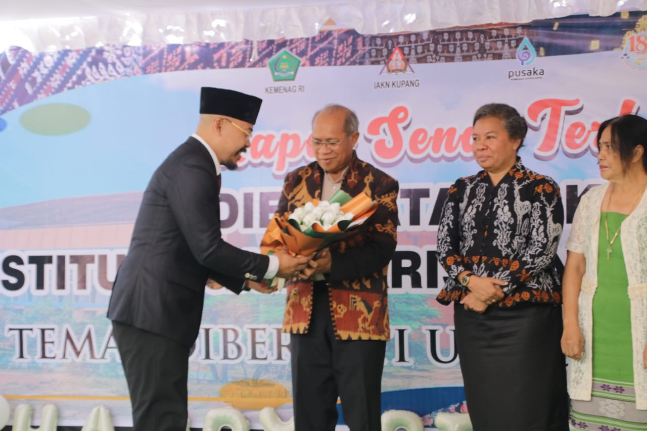 Baca selengkapnyaIAKN Kupang (Kemenag) – Suasana penuh kehangatan mewarnai peringatan Dies Natalis ke-18 Institut Agama Kristen Negeri (IAKN) Kupang yang digelar dalam Rapat Senat Terbuka bertema “Diberkati untuk Memberkati”, Jumat (26/9/2025). Salah satu momen berkesan dalam acara ini adalah pemberian buket bunga kepada para pendiri kampus sebagai bentuk penghormatan dan ucapan terima kasih atas dedikasi mereka […]
