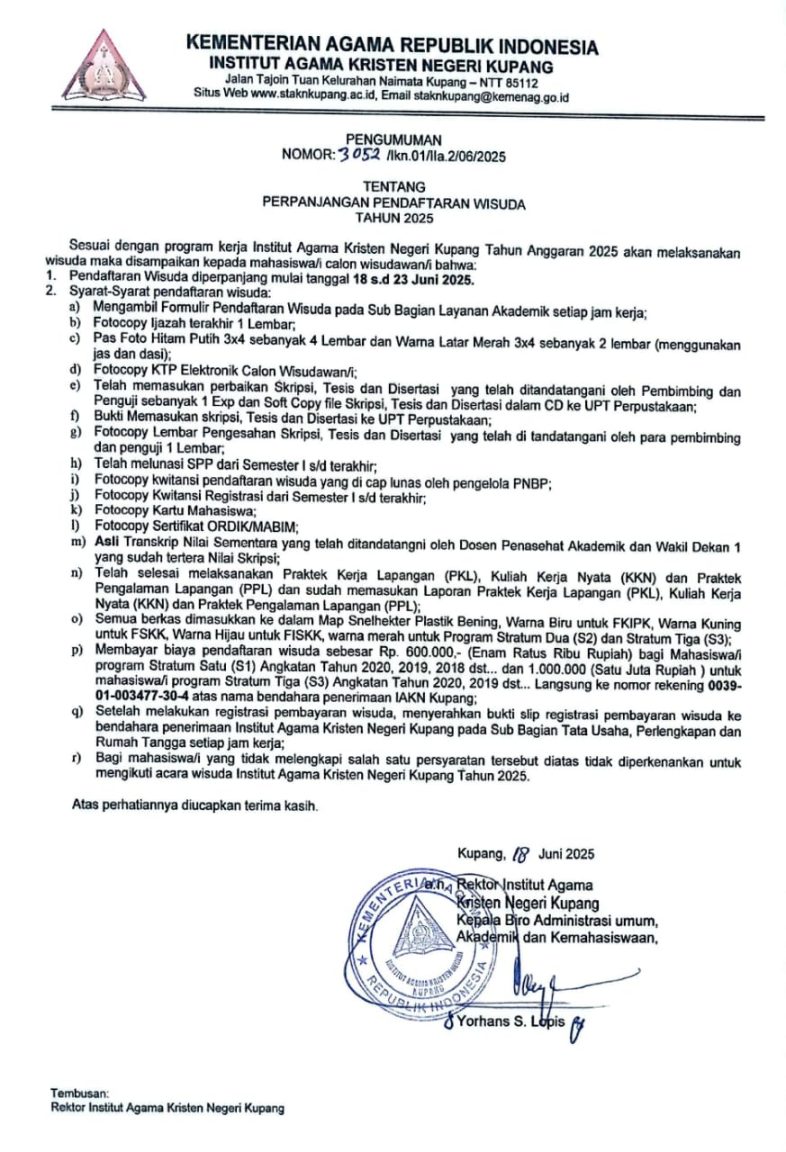Baca selengkapnyaIAKN Kupang (Kemenag) — Mengawali aktivitas mingguan, Institut Agama Kristen Negeri (IAKN) Kupang menggelar Apel pada Senin pagi (23/06/2025) di halaman kampus. Kegiatan rutin ini menjadi ruang refleksi sekaligus penguatan komitmen bersama seluruh civitas akademika dalam membangun etos kerja yang disiplin dan spiritualitas yang tangguh. Dalam apel yang dipimpin oleh Dekan Fakultas Keguruan dan Ilmu […]