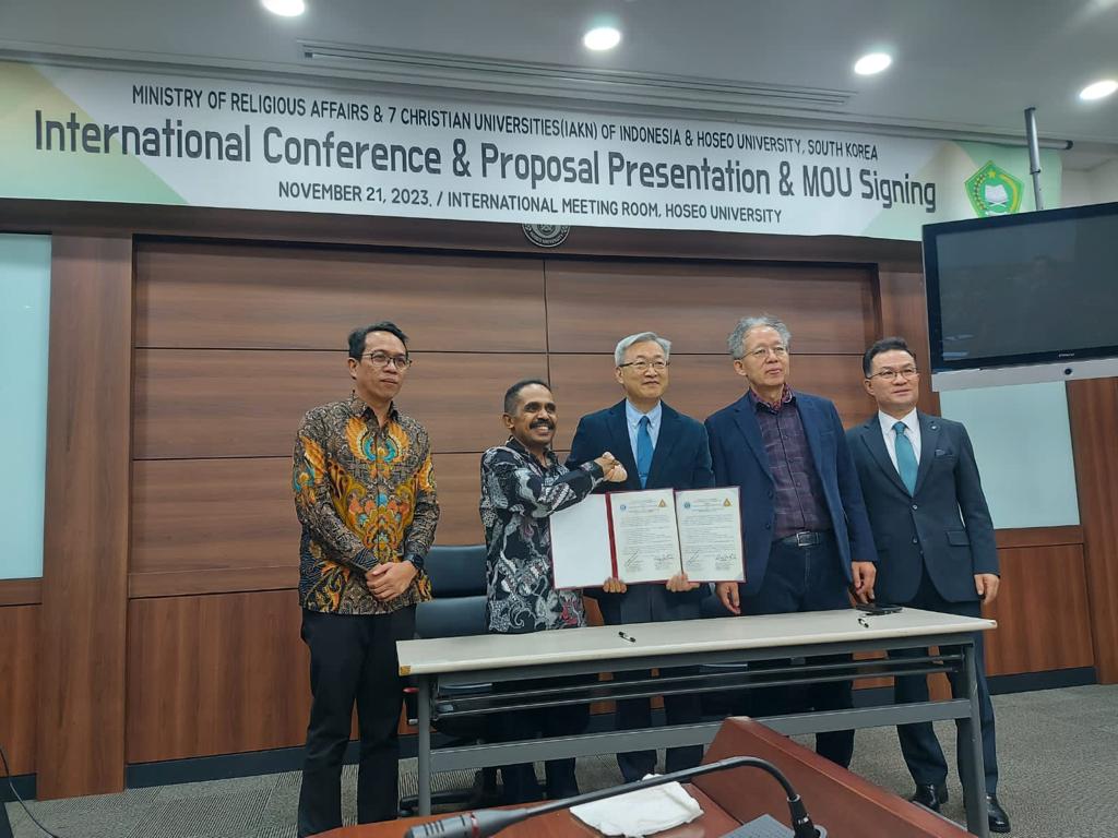 Baca selengkapnyaIAKN Kupang (Kemenag) – – – Pada hari Senin, (21/11/2023), terjadi peristiwa bersejarah dengan penandatanganan Memorandum of Understanding (MoU) antara Institut Agama Kristen Negeri (IAKN) Kupang dengan Hoseo University di Kampus Hoseo University, Korea Selatan. Penandatangan MOU dilakukan oleh Dr. Harun Yermia Natonis, M.Si, selaku Rektor IAKN Kupang, dan Dae Hyun Kim, Ph.D, yang menjabat […]