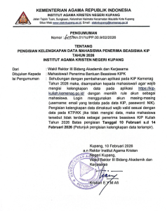 PENGUMUMAN PENGISIAN KELENGKAPAN DATA MAHASIWA PENERIMA BEASISWA KIP TAHUN 2026 10 Februari 2026 13:49 WITA | iakn kupang | Berita Kampus, Headline Utama, Seputar Kampus Previous Next LAMPIRAN PENGUMUMAN Silakan Ikuti IAKN Kupang di Social Media Post navigation Sebelumnya: Berakar dalam Kristus, IAKN Kupang Buka Semester Genap 2025/2026Selanjutnya: PENDAFTARAN MAHASISWA BARU JALUR SELEKSI NASIONAL TELAH DIBUKA! Berita Kampus Lainnya PENGUMUMAN PENGAMBILAN TOGA, IBADAH PENGUTUSAN DAN GLADI RESIK WISUDA PERIODE I 2026 13/03/2026 Lima Dosen IAKN Kupang Raih Jabatan Fungsional Lektor Kepala dan Asisten Ahli, Rektor Ajak Warga Kampus Perkuat Kolaborasi Positif 12/03/2026 Lomba Pidato Antar SMA/SMK/SMTK di Kota Kupang Yang Digelar Oleh Fakultas Keguruan & Ilmu Pendidikan Kristen-IAKN Kupang Berlangsung Meriah 12/03/2026 FKIPK IAKN Kupang Gelar Yudisium : 37 Mahasiswa Resmi Menyelesaikan Studi 12/03/2026 PENGUMUMAN PERPANJANGAN PENDAFTARAN WISUDA PERIODE I TAHUN 2026 10/03/2026 IAKN Kupang Gandeng Robby R. Meka Bedah Buku “KONTRAPUNG”, Perkuat Kualitas Musikalitas Mahasiswa 06/03/2026 IAKN Kupang Matangkan Pengabdian kepada Masyarakat 2026, Dorong Model Berkelanjutan Menuju Transformasi Universitas 03/03/2026 IAKN Kupang dan Yayasan Rumah Literasi Cakrawala Jalin Kerja Sama Pengembangan Literasi untuk Masa Depan NTT 02/03/2026 Rektor IAKN Kupang Serahkan SK Plt. Kepala Biro AUAK 02/03/2026 Sosialisasi PMB Pascasarjana IAKN Kupang di Kantor Kemenag Kabupaten TTS 02/03/2026 Kategori Acara & Tulisan IlmiahBerita KampusKabar FakultasPendidikanPenelitian dan InovasiPojok DosenPojok RektorPrestasiSEKILAS IAKN KUPANGSeminar/WorkshopSeputar Kampus Kontak Kami Institut Agama Kristen Negeri (IAKN) Kupang Jalan Tajoin Tuan, Kel. Naimata, Kec. Maulafa Kota Kupang – NTT 85147 (0380) 824911 staknkupang@kemenag.go.id Berita Terbaru PENGUMUMAN PENGAMBILAN TOGA, IBADAH PENGUTUSAN DAN GLADI RESIK WISUDA PERIODE I 2026 13/03/2026 Berita Kampus, Headline Utama, Seputar Kampus Baca selengkapnya Lima Dosen IAKN Kupang Raih Jabatan Fungsional Lektor Kepala dan Asisten Ahli, Rektor Ajak Warga Kampus Perkuat Kolaborasi Positif 12/03/2026 Berita Kampus, Headline Utama, Seputar Kampus Baca selengkapnya Lomba Pidato Antar SMA/SMK/SMTK di Kota Kupang Yang Digelar Oleh Fakultas Keguruan & Ilmu Pendidikan Kristen-IAKN Kupang Berlangsung Meriah 12/03/2026 Berita Kampus, Headline Utama, Seputar Kampus Baca selengkapnya FKIPK IAKN Kupang Gelar Yudisium : 37 Mahasiswa Resmi Menyelesaikan Studi 12/03/2026 Berita Kampus, Headline Utama, Seputar Kampus Baca selengkapnya