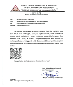 PENGUMUMAN PENGISIAN KRS PERIODE GANJIL 2025 20 September 2025 11:06 WITA | iakn kupang | Berita Kampus, Headline Utama, Seputar Kampus Previous Next Silakan Ikuti IAKN Kupang di Social Media Post navigation Sebelumnya: PENGUMUMAN PERPANJANGAN REGISTRASI SEMESTER GANJIL TAHUN AKADEMIK 2025/2026Selanjutnya: IAKN Kupang Lepas 835 Mahasiswa PPL dan PKL Tahun 2025: Rektor Ajak Mahasiswa Terus Bermimpi, Wujudkan Pelayanan Sejalan dengan Asta Protas Kemenag RI Berita Kampus Lainnya PENGUMUMAN PENGAMBILAN TOGA, IBADAH PENGUTUSAN DAN GLADI RESIK WISUDA PERIODE I 2026 13/03/2026 Lima Dosen IAKN Kupang Raih Jabatan Fungsional Lektor Kepala dan Asisten Ahli, Rektor Ajak Warga Kampus Perkuat Kolaborasi Positif 12/03/2026 Lomba Pidato Antar SMA/SMK/SMTK di Kota Kupang Yang Digelar Oleh Fakultas Keguruan & Ilmu Pendidikan Kristen-IAKN Kupang Berlangsung Meriah 12/03/2026 FKIPK IAKN Kupang Gelar Yudisium : 37 Mahasiswa Resmi Menyelesaikan Studi 12/03/2026 PENGUMUMAN PERPANJANGAN PENDAFTARAN WISUDA PERIODE I TAHUN 2026 10/03/2026 IAKN Kupang Gandeng Robby R. Meka Bedah Buku “KONTRAPUNG”, Perkuat Kualitas Musikalitas Mahasiswa 06/03/2026 IAKN Kupang Matangkan Pengabdian kepada Masyarakat 2026, Dorong Model Berkelanjutan Menuju Transformasi Universitas 03/03/2026 IAKN Kupang dan Yayasan Rumah Literasi Cakrawala Jalin Kerja Sama Pengembangan Literasi untuk Masa Depan NTT 02/03/2026 Rektor IAKN Kupang Serahkan SK Plt. Kepala Biro AUAK 02/03/2026 Sosialisasi PMB Pascasarjana IAKN Kupang di Kantor Kemenag Kabupaten TTS 02/03/2026 Kategori Acara & Tulisan IlmiahBerita KampusKabar FakultasPendidikanPenelitian dan InovasiPojok DosenPojok RektorPrestasiSEKILAS IAKN KUPANGSeminar/WorkshopSeputar Kampus Kontak Kami Institut Agama Kristen Negeri (IAKN) Kupang Jalan Tajoin Tuan, Kel. Naimata, Kec. Maulafa Kota Kupang – NTT 85147 (0380) 824911 staknkupang@kemenag.go.id Berita Terbaru PENGUMUMAN PENGAMBILAN TOGA, IBADAH PENGUTUSAN DAN GLADI RESIK WISUDA PERIODE I 2026 13/03/2026 Berita Kampus, Headline Utama, Seputar Kampus Baca selengkapnya Lima Dosen IAKN Kupang Raih Jabatan Fungsional Lektor Kepala dan Asisten Ahli, Rektor Ajak Warga Kampus Perkuat Kolaborasi Positif 12/03/2026 Berita Kampus, Headline Utama, Seputar Kampus Baca selengkapnya Lomba Pidato Antar SMA/SMK/SMTK di Kota Kupang Yang Digelar Oleh Fakultas Keguruan & Ilmu Pendidikan Kristen-IAKN Kupang Berlangsung Meriah 12/03/2026 Berita Kampus, Headline Utama, Seputar Kampus Baca selengkapnya FKIPK IAKN Kupang Gelar Yudisium : 37 Mahasiswa Resmi Menyelesaikan Studi 12/03/2026 Berita Kampus, Headline Utama, Seputar Kampus Baca selengkapnya