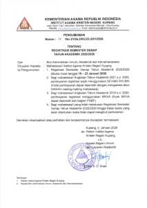 PENGUMUMAN REGISTRASI SEMESTER GENAP TAHUN AKADEMIK 2025/2026 14 Januari 2026 13:11 WITA | iakn kupang | Berita Kampus, Headline Utama, Seputar Kampus Previous Next Silakan Ikuti IAKN Kupang di Social Media Post navigation Sebelumnya: PENGUMUMAN PENGAMBILAN IJAZAH WISUDAWAN/WISUDAWATI IAKN KUPANG PERIODE OKTOBER 2025/2026 Berita Kampus Lainnya PENGUMUMAN PENGAMBILAN IJAZAH WISUDAWAN/WISUDAWATI IAKN KUPANG PERIODE OKTOBER 2025/2026 13/01/2026 IAKN Kupang Tutup Peringatan HAB Ke-80 Kemenag dengan Meriah 09/01/2026 IAKN Kupang Gelar Layanan Kesehatan dan Donor Darah dalam Rangka Hari Amal Bhakti Kementerian Agama ke-80 07/01/2026 IAKN Kupang Peringati Hari Amal Bhakti Ke-80 Kemenag RI, Usung Semangat Kerukunan dan Sinergi 07/01/2026 Rektor IAKN Kupang Dr. I Made Suardana, M.Th Hadiri Perayaan Natal Kemenag RI Tahun 2025 07/01/2026 Perluas Jejaring Kolaborasi, IAKN Kupang Jajaki Kerja Sama Strategis dengan UIN Alauddin Makassar 07/01/2026 Perkuat Sinergi PTKN, IAKN Kupang Gandeng UIN Palopo dalam Transformasi Kelembagaan dan Tri Dharma 07/01/2026 IAKN Kupang Perkuat Kolaborasi Pengembangan SDM dan Kelembagaan bersama IAKN Toraja 07/01/2026 Akselerasi Transformasi Kelembagaan, IAKN Kupang Jalin Kemitraan Strategis dengan IAIN Parepare 06/01/2026 Itjen Kemenag RI Lakukan Audit Implementasi Asta Protas di IAKN Kupang 06/01/2026 Kategori Acara & Tulisan IlmiahBerita KampusKabar FakultasPendidikanPenelitian dan InovasiPojok DosenPojok RektorPrestasiSEKILAS IAKN KUPANGSeminar/WorkshopSeputar Kampus Kontak Kami Institut Agama Kristen Negeri (IAKN) Kupang Jalan Tajoin Tuan, Kel. Naimata, Kec. Maulafa Kota Kupang – NTT 85147 (0380) 824911 staknkupang@kemenag.go.id Berita Terbaru PENGUMUMAN REGISTRASI SEMESTER GENAP TAHUN AKADEMIK 2025/2026 14/01/2026 Berita Kampus, Headline Utama, Seputar Kampus Baca selengkapnya PENGUMUMAN PENGAMBILAN IJAZAH WISUDAWAN/WISUDAWATI IAKN KUPANG PERIODE OKTOBER 2025/2026 13/01/2026 Berita Kampus Baca selengkapnya IAKN Kupang Tutup Peringatan HAB Ke-80 Kemenag dengan Meriah 09/01/2026 Berita Kampus, Headline Utama, Seputar Kampus Baca selengkapnya IAKN Kupang Gelar Layanan Kesehatan dan Donor Darah dalam Rangka Hari Amal Bhakti Kementerian Agama ke-80 07/01/2026 Berita Kampus, Headline Utama, Seputar Kampus Baca selengkapnya