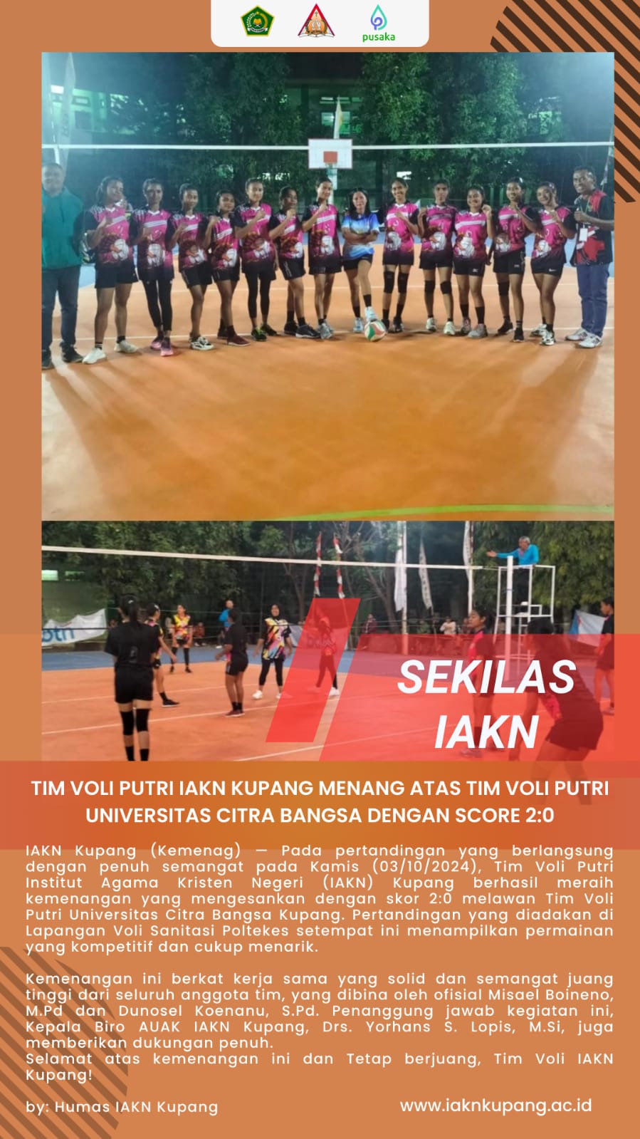 Tim Voli Putri IAKN Kupang menang 2:0 melawan Universitas Citra Bangsa 3 Oktober 2024 22:23 WITA | IAKN Kupang | SEKILAS IAKN KUPANG Silakan Ikuti IAKN Kupang di Social Media Post navigation Sebelumnya: WR 1 IAKN Kupang, Maryon D. Pattinaja, Ph.D memimpin Rapat Pemantapan Persiapan AL Untuk Prodi Kepemimpinan Kristen dan Prodi MisiologiSelanjutnya: Rapat Pembentukan Senat IAKN Kupang Periode 2024 – 2028 SEKILAS IAKN KUPANG Lainnya PENDAFTARAN MAHASISWA BARU JALUR SELEKSI NASIONAL TELAH DIBUKA! 11/02/2026 Penetapan Kelulusan Hasil Seleksi PMB Jalur Mandiri Gelombang II T.A 2025/2026 27/08/2025 PENGUMUMAN DAFTAR ULANG BAGI LULUSAN SELEKSI NASIONAL LAJUR UJIAN TULIS – ONLINE 2025 03/06/2025 PEMBUKAAN PENDAFTARAN PENERIMAAN MAHASISWA BARU JALUR MANDIRI 2025/2026 (SARJANA & PASCASARJANA) 23/04/2025 Jadwal Pendaftaran Penerimaan Mahasiswa Baru Jalur Seleksi Nasional Institut Agama Kristen Negeri Kupang T.A. 2025/2026 13/02/2025 30/01/2025 30/01/2025 Perayaan HAB ke-79 KEMENAG RI di Lingkup IAKN Kupang 02/01/2025 Rangkaian Kegiatan Hari Amal Bakti Ke-79 02/01/2025 IAKN Kupang Tunjukkan Kreativitas Mahasiswa di LLDIKTI XV FAIR-2024 13/12/2024 Kategori Acara & Tulisan IlmiahBerita KampusKabar FakultasPendidikanPenelitian dan InovasiPojok DosenPojok RektorPrestasiSEKILAS IAKN KUPANGSeminar/WorkshopSeputar Kampus Kontak Kami Institut Agama Kristen Negeri (IAKN) Kupang Jalan Tajoin Tuan, Kel. Naimata, Kec. Maulafa Kota Kupang – NTT 85147 (0380) 824911 staknkupang@kemenag.go.id Berita Terbaru 3rd NCAP 2026 IAKN Kupang: Seni Pertunjukan sebagai Perekat Harmoni dalam Masyarakat Multikultural 27/04/2026 Berita Kampus, Headline Utama, Seputar Kampus Baca selengkapnya IAKN Kupang Peringati Hari Kartini: Wujudkan Integritas dan Profesionalisme 27/04/2026 Berita Kampus, Headline Utama, Seputar Kampus Baca selengkapnya Apel Kesadaran IAKN Kupang Tekankan Kebersamaan, Kreativitas, dan Budaya Mutu 27/04/2026 Berita Kampus, Headline Utama, Seputar Kampus Baca selengkapnya IAKN Kupang Tegaskan Spiritualitas Kerja: “Dari Rutinitas Menjadi Ibadah yang Hidup” 27/04/2026 Berita Kampus, Headline Utama, Seputar Kampus Baca selengkapnya